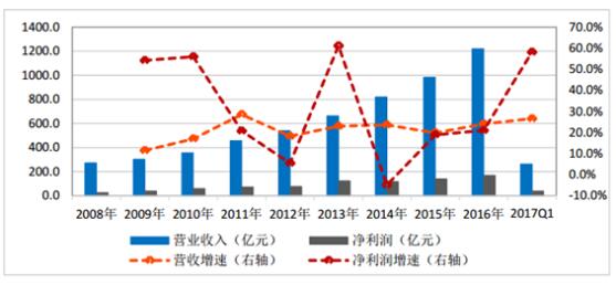 2008-2017年環(huán)保行業(yè)上市公司營(yíng)收及凈利潤(rùn)變化情況