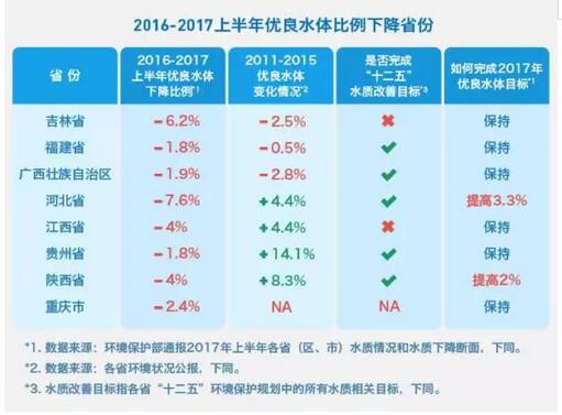 4.2017上半年出現下降的省份中,吉林、江西沒有完成“十二五”水質改善目標,重慶“十二五”水質信息公開不完整。