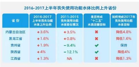 4.2017上半年喪失使用功能水體比例上升的省份中,內蒙古、黑龍江和江西均未完成“十二五”水質改善目標。